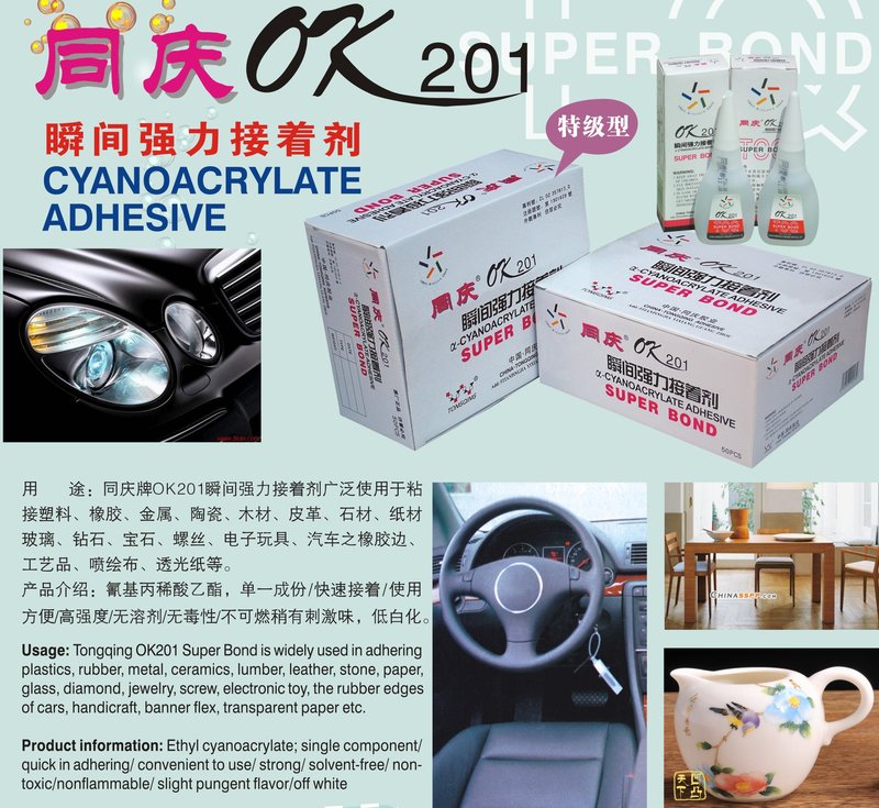 主要品種有:1、丙烯酸酯膠(瞬間膠) 502、AA超能膠、OK201、三秒、101修鞋膠、冬膠王、精品三秒等。2、電子工業(yè)類用膠系列:特種膠粘劑(UV無影膠、有機(jī)玻璃(壓克力)新一代粘合劑、有機(jī)玻璃粘合劑、ABS塑 料膠等)。3、環(huán)氧AB膠、厭氧膠、改性丙烯酸酯膠(AB-302)、 青紅膠、噴膠、水晶滴膠等。除以上產(chǎn)品,本公司還有特殊材質(zhì),如要求的高技術(shù)產(chǎn)品,只要您把需粘接的材質(zhì)寄予本公司,我公司技術(shù)部三天內(nèi)便可回復(fù)解決結(jié)果。誠信經(jīng)營是我們永遠(yuǎn)不變的宗旨,精益求精是我們一貫的追求,我們希望能以優(yōu)質(zhì)的產(chǎn)品質(zhì)量,優(yōu)惠的價(jià)格,完善的服務(wù),來滿足各界用戶的需求!